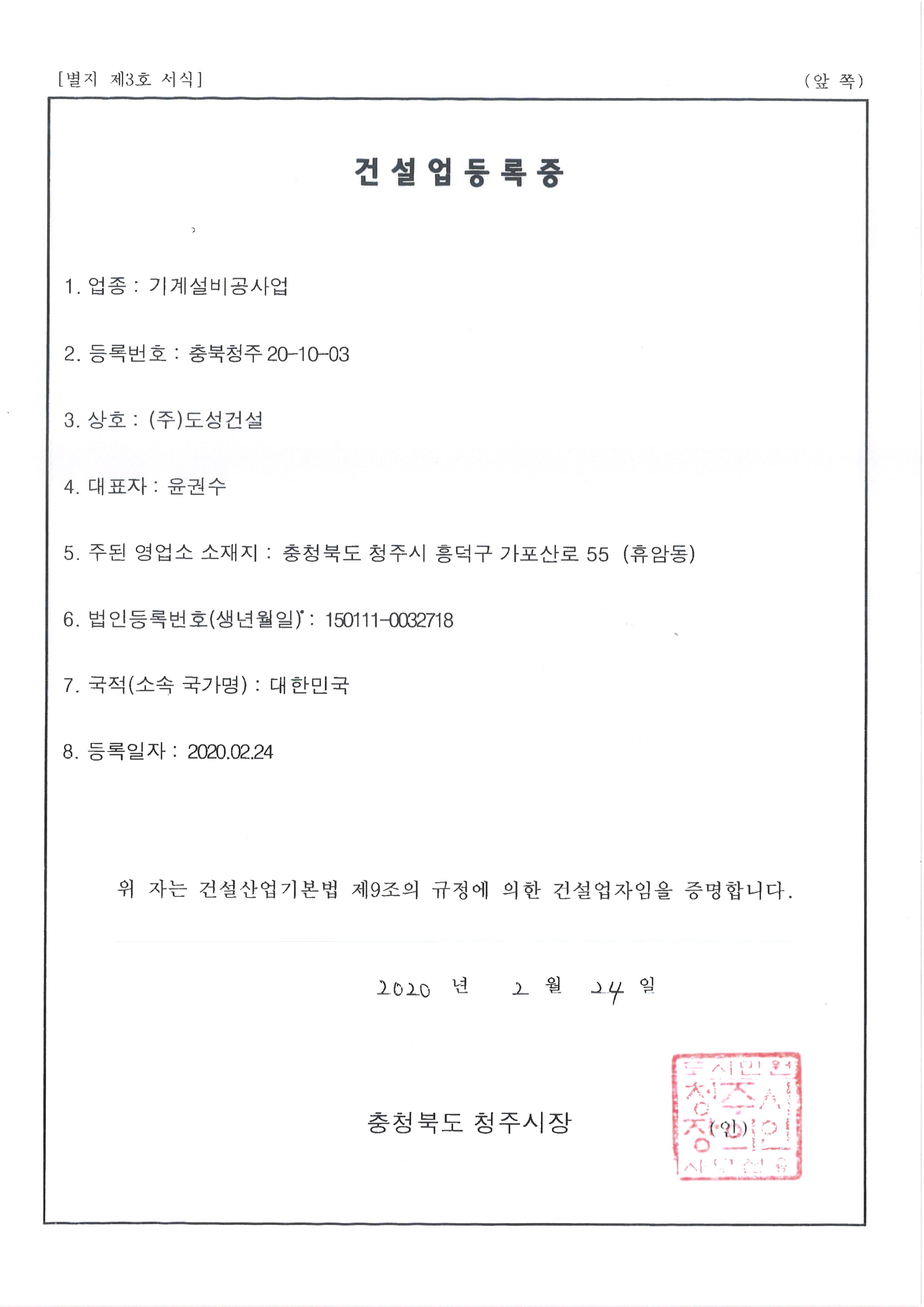 Construction business registration card. [Chungcheongbuk-do Cheongju 20-10-03]